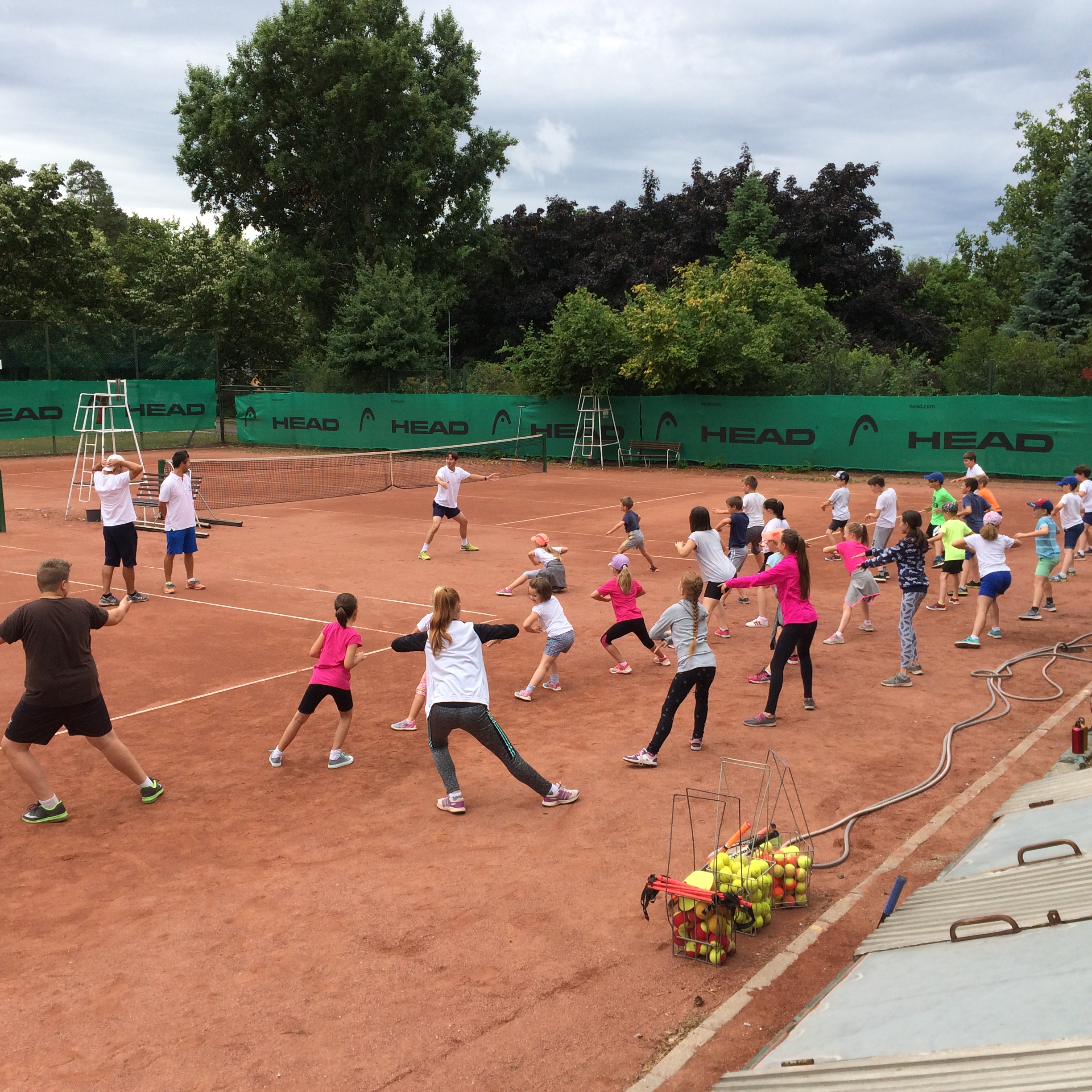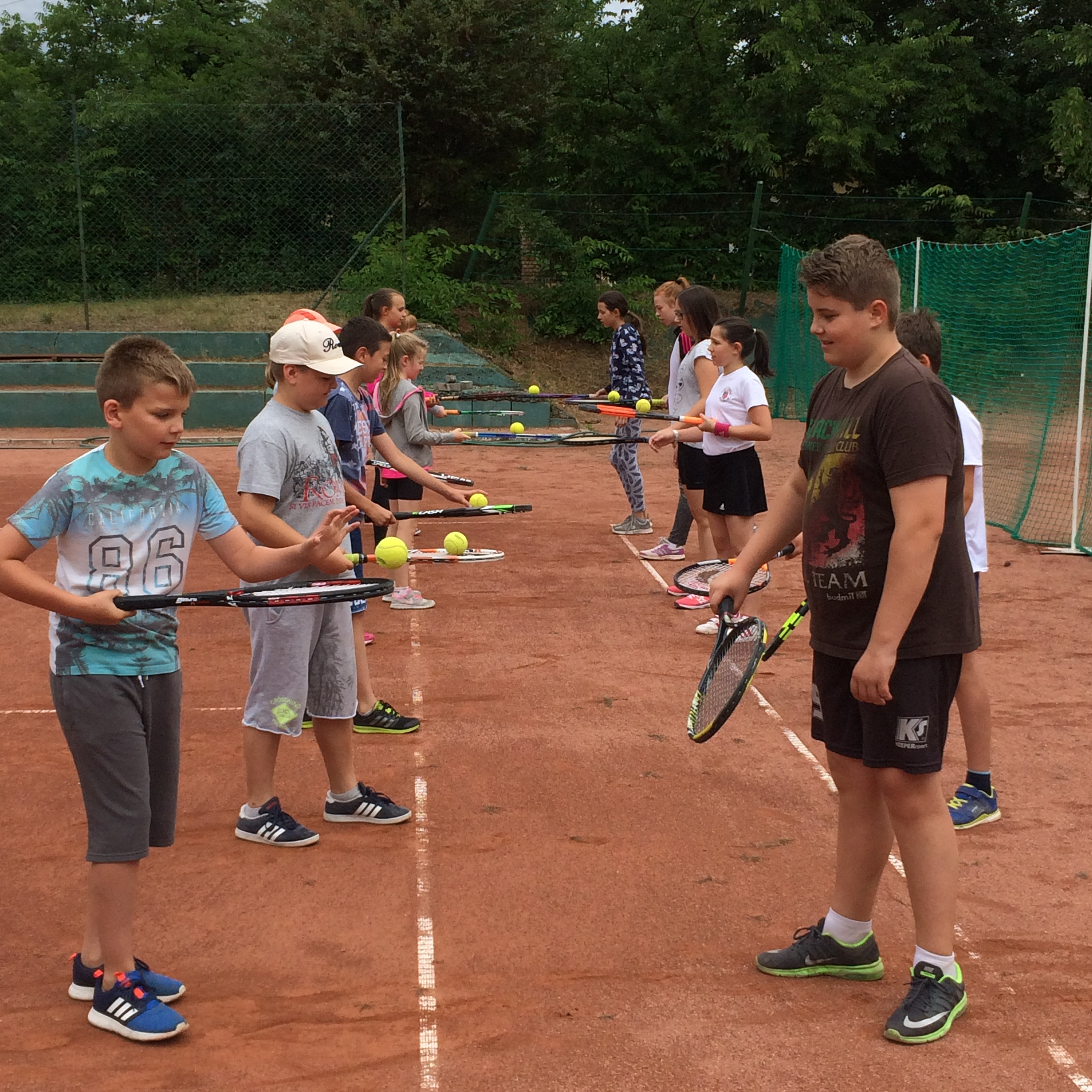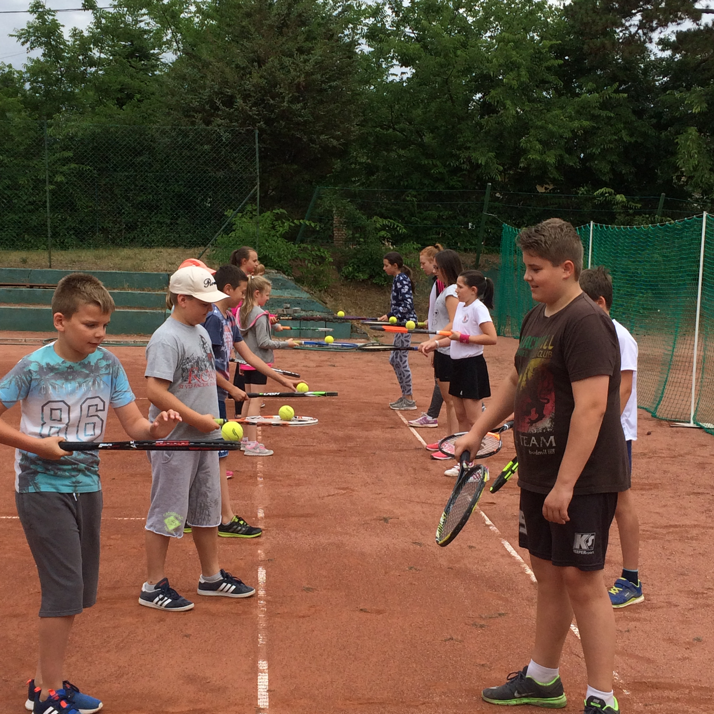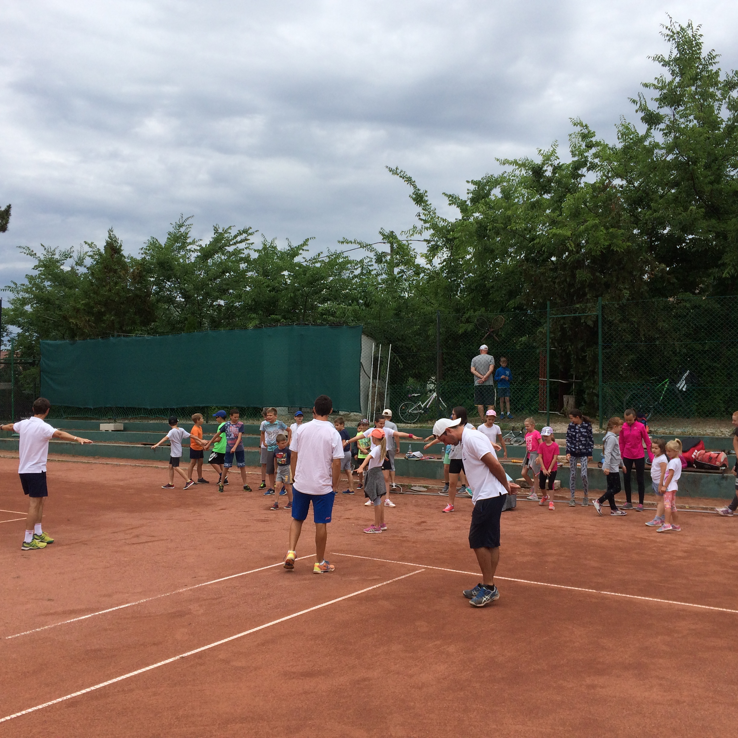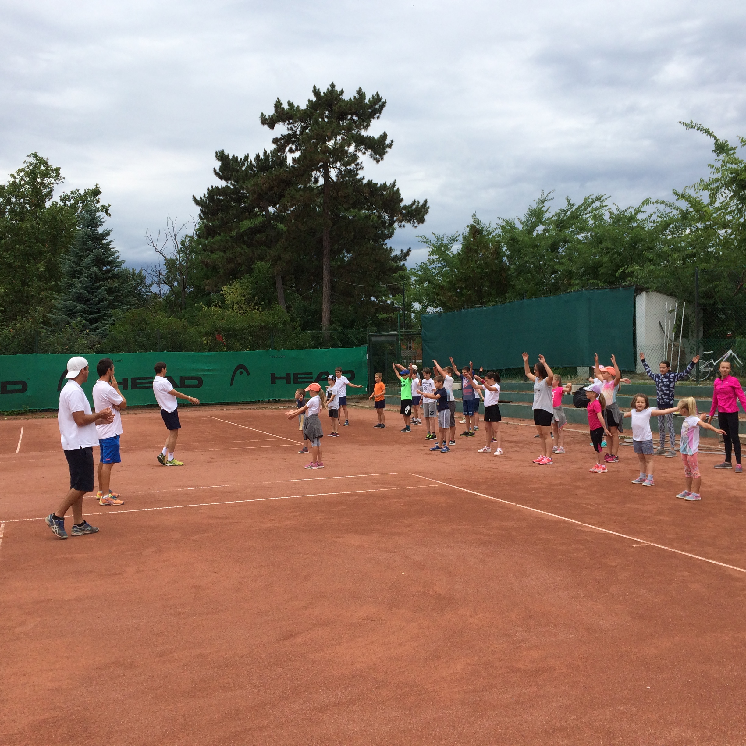 Közös edzés a Tata Városi Tenisz Klub gyermekeinek 2017 júliusában